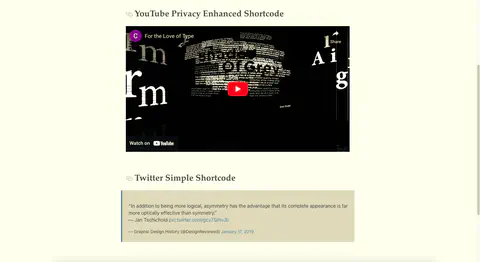 Hugo ships with several Built-in Shortcodes for rich content, along with a Privacy Config and a set of Simple Shortcodes that enable static and no-JS versions of various social media embeds.